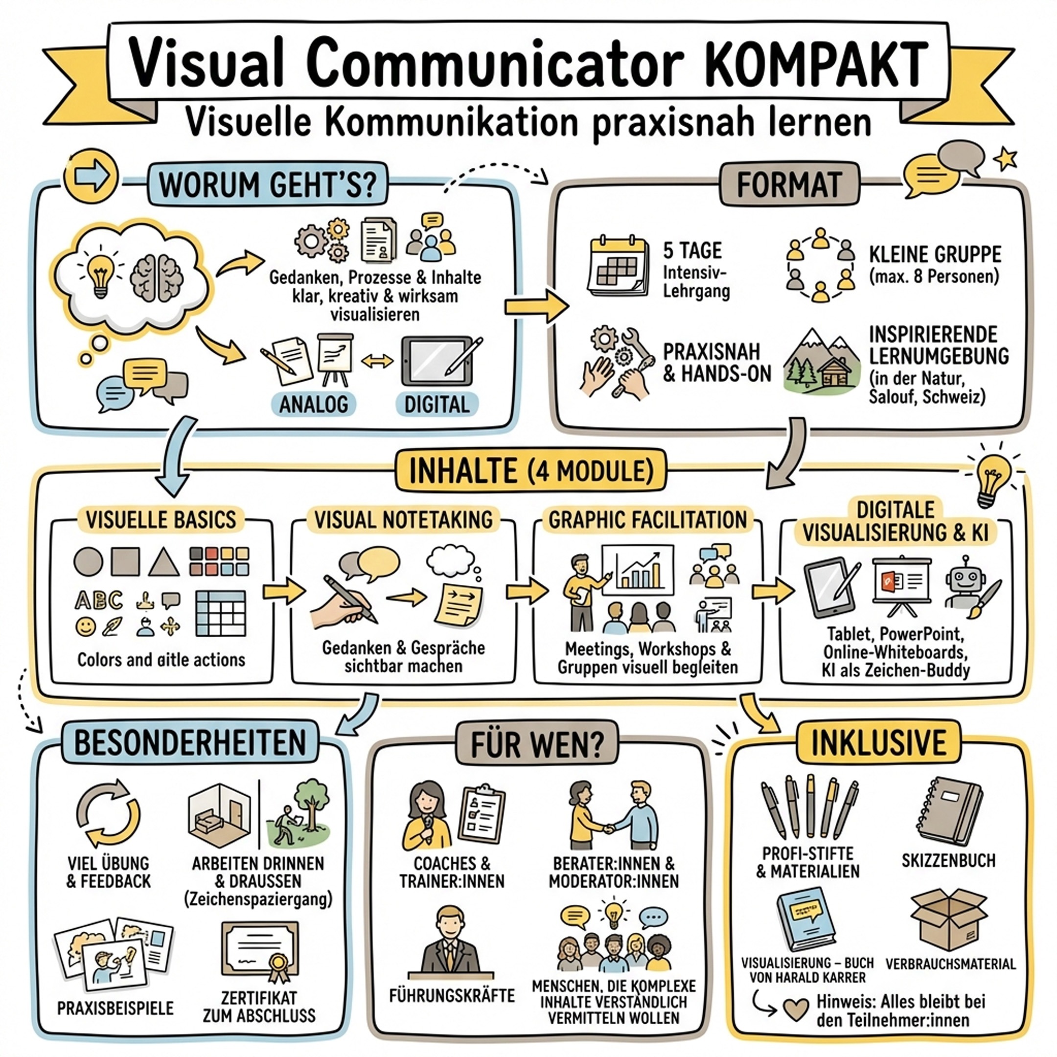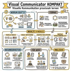 In fünf intensiven Tagen entwickeln Sie die Fähigkeit, Komplexität sichtbar zu machen, Gespräche zu strukturieren und Ergebnisse merk-würdig zu sichern.